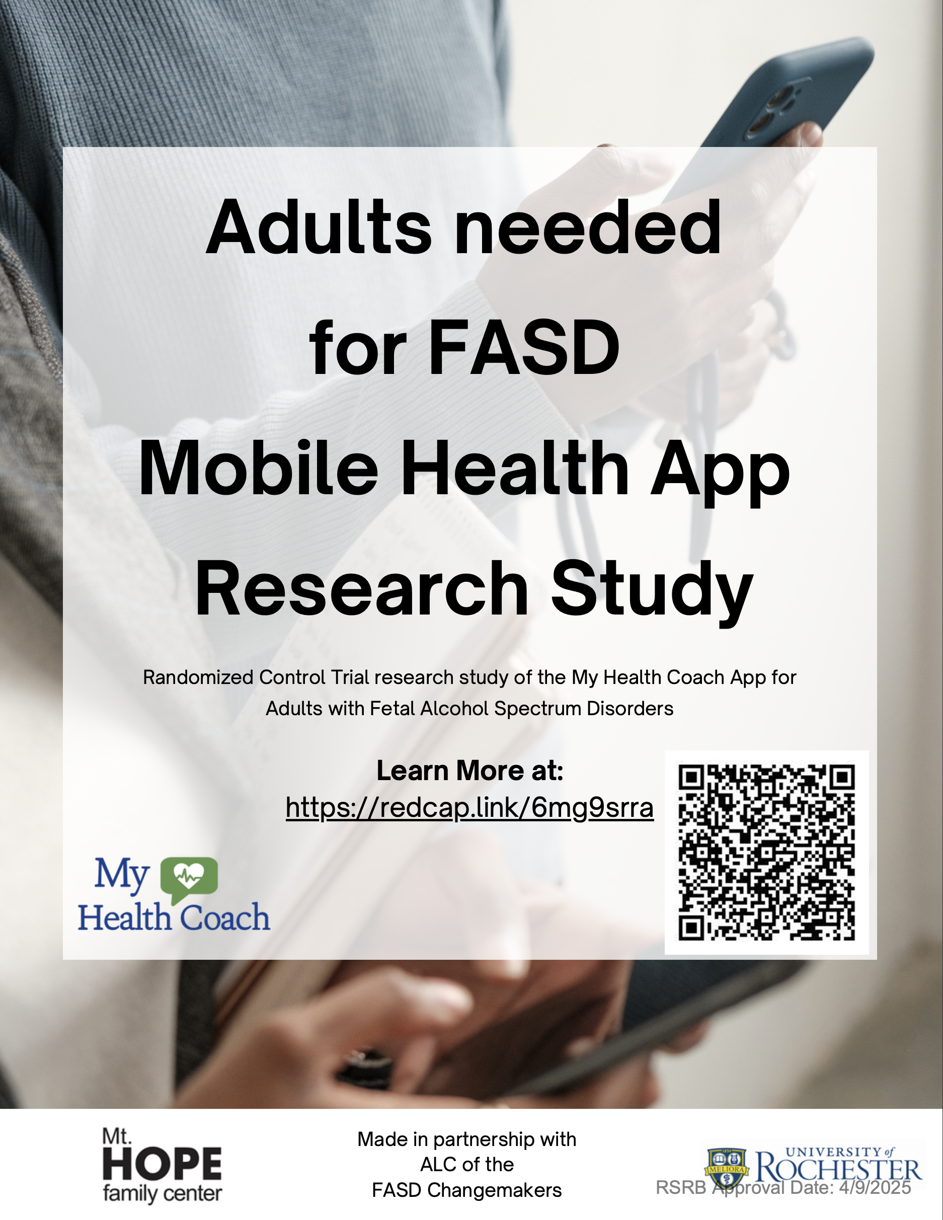 Are you 18 years or older and been diagnosed with FASD or known prenatal alcohol exposure? You may qualify for this study. University of Rochester’s researchers are partnering with the Adult Leadership Collaborative of the FASD Changemakers to develop a new app for adults with FASD. This app provides resources, tools, and information to improve physical health and quality of life for adults with FASD or known prenatal alcohol exposure. Participate in a feasibility study to try the app to give feedback on how well it works and receive monetary compensation. Learn more at https://bit.ly/adult_app_trial