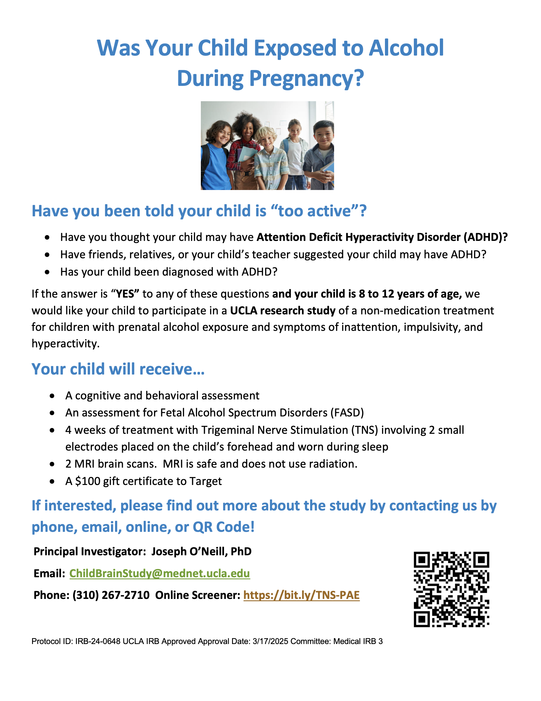 A UCLA research study of a non-medication treatment for children with prenatal alcohol exposure and symptoms of inattention, impulsivity, and hyperactivity is recruiting. For more information about the study, click here.